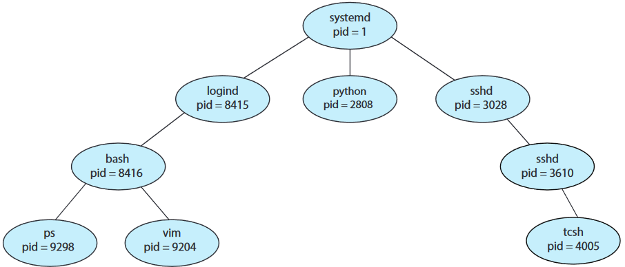 대부분의 운영체제에서는 프로세스를 고유한 프로세스 식별자 process identifier (혹은 pid)를 통해 구분. 보통 정수임.