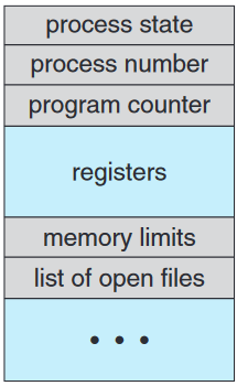 운영체제에서 각 프로세스는 프로세스 제어 블록 process control block (PCB)의 형태. 작업 제어 블록 task control block이라고도 부름. PCB의 구성: