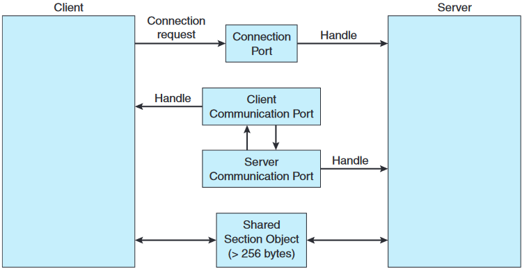 윈도우즈에서는 유닉스보다 더 풍부한 통신 메커니즘 제공. 전이중 통신 방식 가능, 통신 프로세스는 같은 기계 내에서도 되고 달라도 됨. 유닉스는 바이트 기준의 자료만 전송 가능한데 윈도우즈는 바이트 기준이든 메시지 기준이든 가능. CreateNamedPipe() 함수로 명명된 파이프 생성. ConnectNamedPipe() 함수로 클라이언트가 연결. ReadFile()과 WriteFile() 함수로 통신.