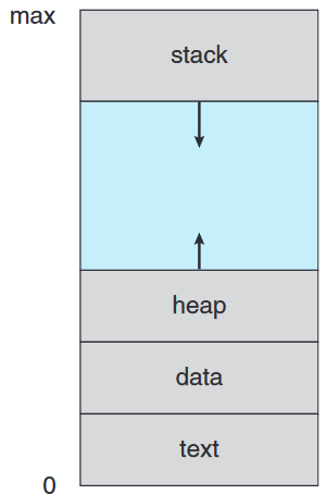 텍스트와 자료 섹션의 크기는 고정. 각 함수 호출 때마다 함수 매개변수, 지역 변수, 반환 주소 등을 포함한 활성화 기록 activation record이 스택에 푸시됨; 제어가 함수에서 반환될 때 활성화 기록은 스택에서 팝됨. 힙도 동적 할당에 따라 크기 변함. 스택과 힙은 서로를 향해 커지만 서로 겹치지 않도록 운영체제가 보장해야.