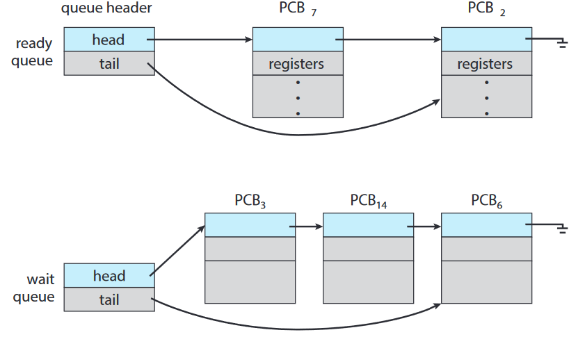 프로세스가 시스템에 들어오면 준비 상태 큐 ready queue에 저장. 보통 연결 리스트의 형태로 저장.