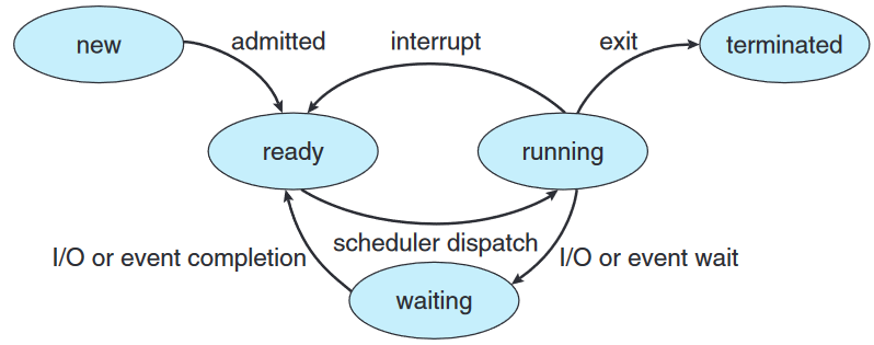 이름은 운영체제마다 달라서 중요하지 않음. 물론 이 상태의 역할에 대응하는 건 모든 운영체제에 다 있음. 중요한 건 한 순간에 오로지 한 프로세스만이 실행 중임. 많은 프로세스는 준비 상태거나 대기 상태.