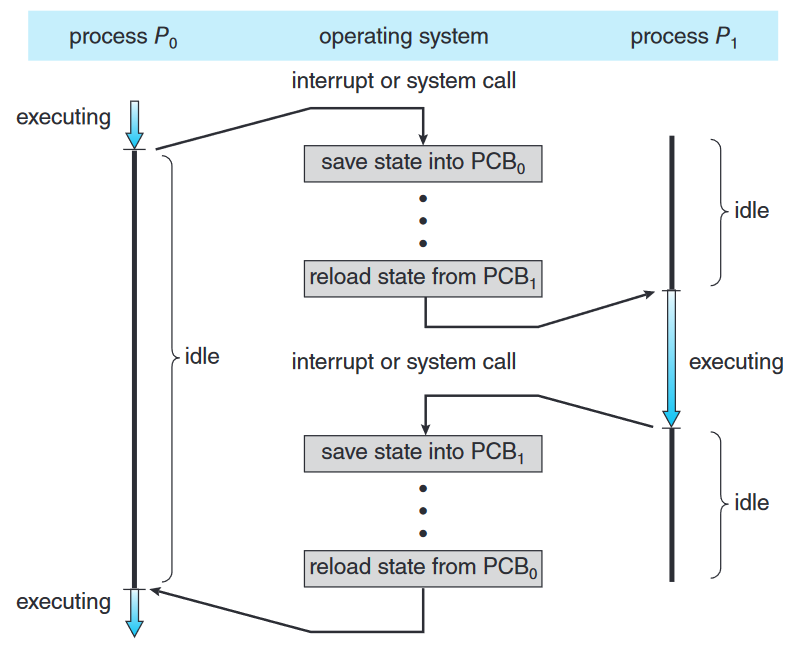 CPU 코어의 프로세스를 다른 걸로 바꾸려면 현재 프로세스의 상태 저장하고 다른 프로세스를 상태 복구해주면 됨. 이게 문맥 교환 context switch. 문맥 교환에 걸리는 시간은 순수하게 오버헤드임. 교환할 때 다른 의미있는 작업을 하지 않으니까. 기계마다 메모리 속도, 복사해야 할 레지스터 수, 특수 명령어의 존재 등에 따라 걸리는 시간 다 다름.보통은 몇 마이크로초 걸림.