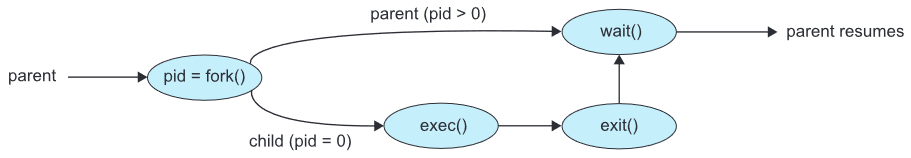 두 개의 서로 다른, 동일한 프로그램 실행 중인 복제본. 자식 프로세스에서 pid의 값은 0, 부모는 0보다 큰 정수값(사실은 그게 자식의 pid). 자식 프로세스는 부모로부터 특권, 스케줄링 속성, 자원 등 부여 받음. 자식 프로세스는 execlp 시스템 호출(exec()의 한 종류)로 자신의 주소 공간에 유닉스 명령어 /bin/ls(경로 목록 필요할 때 사용)를 중첩시킴.