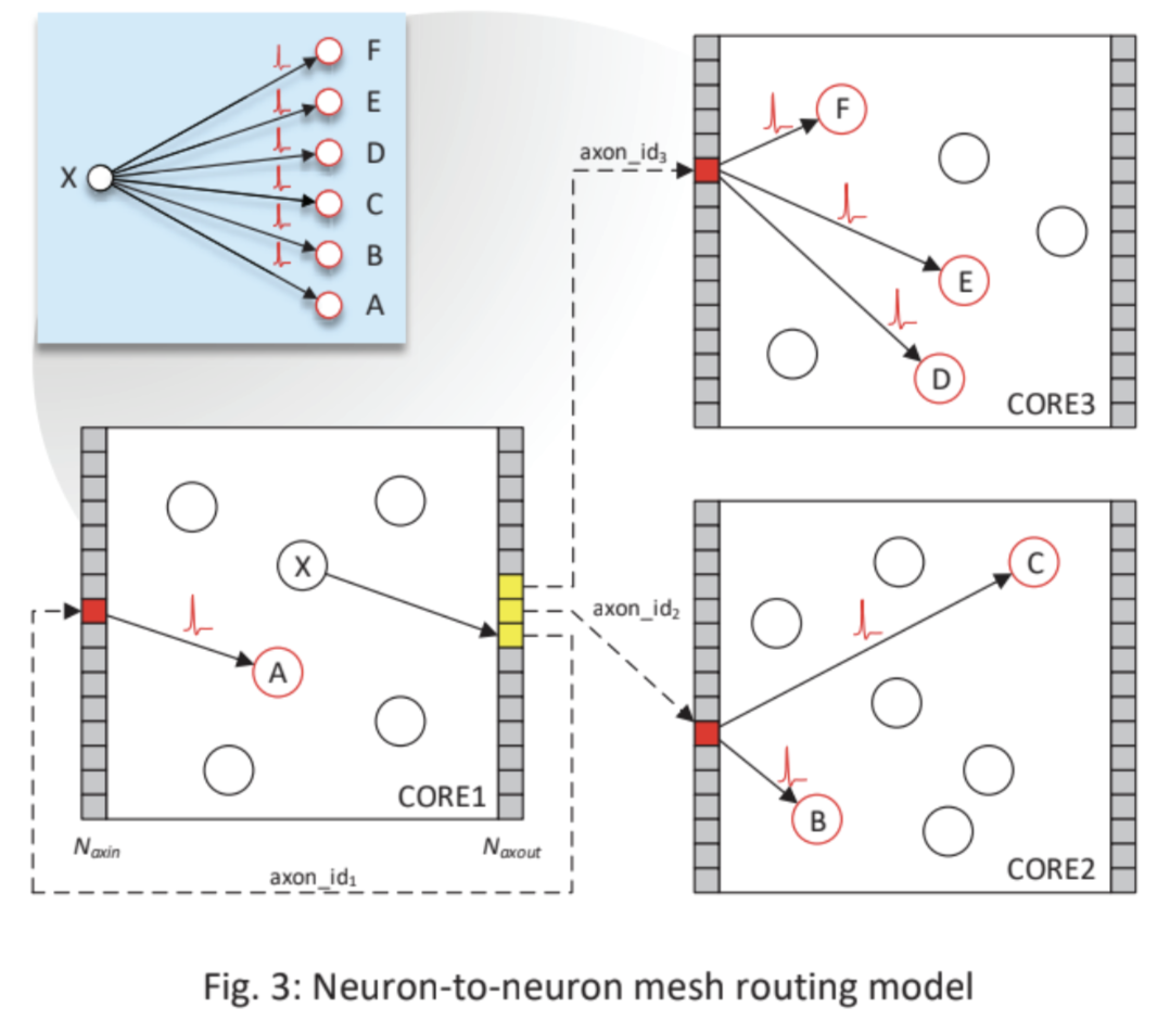 When a neuron’s activation exceeds some threshold level, it generates a spike message that is routed to a set of fanout compartments contained in some number of destination cores.