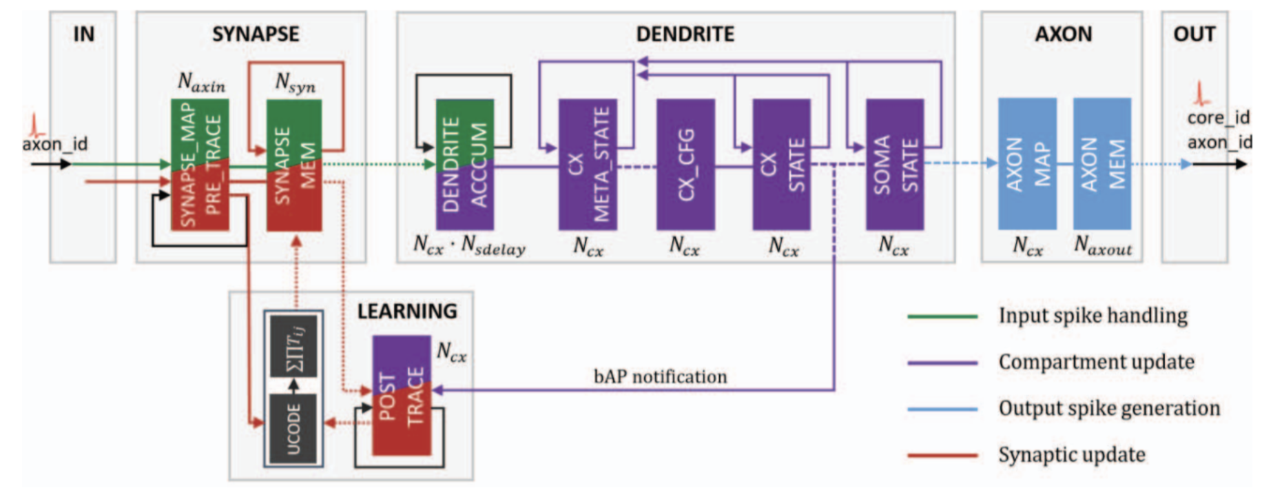 2) 로컬 플로우 컨트롤은 동일한 설계 내의 다른 모듈이 자연스로운 마이크로아키텍쳐 주파수에서 실행. (다양한 시간대에서 스파이크 뉴런 프로세스가 실행되어야 하는 필요와 맞물리며 백엔드 타이밍 클로저를 크게 단순화)