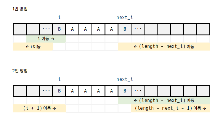 인덱스 i에서 좌측으로 이동 중 A를 만나면 A가 연속되는지 확인한 후 연속된 A가 끝나는 지점 즉, A가 아닌 알파벳이 등장하는 인덱스 next_i를 기록한다. 이때 모든 인덱스에 대하여 A를 제외한 모든 알파벳을 원하는 값으로 바꾸기 위해 이동할 방법은 2가지이다.