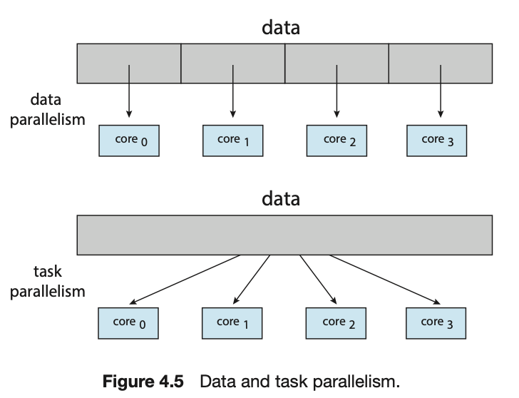 - Data parallelism: 같은 데이터를 여러 코어 간에 분산하여 처리