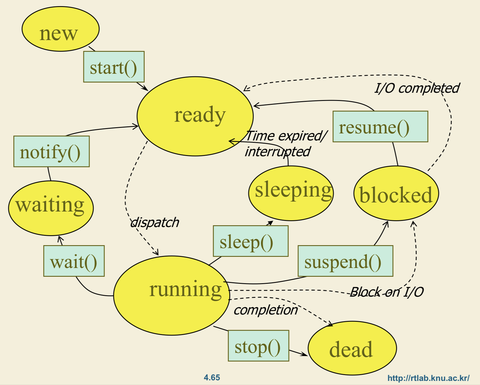 - 스레드는 프로세서 레지스터 상에 있을 때, 실행중이라고 함
