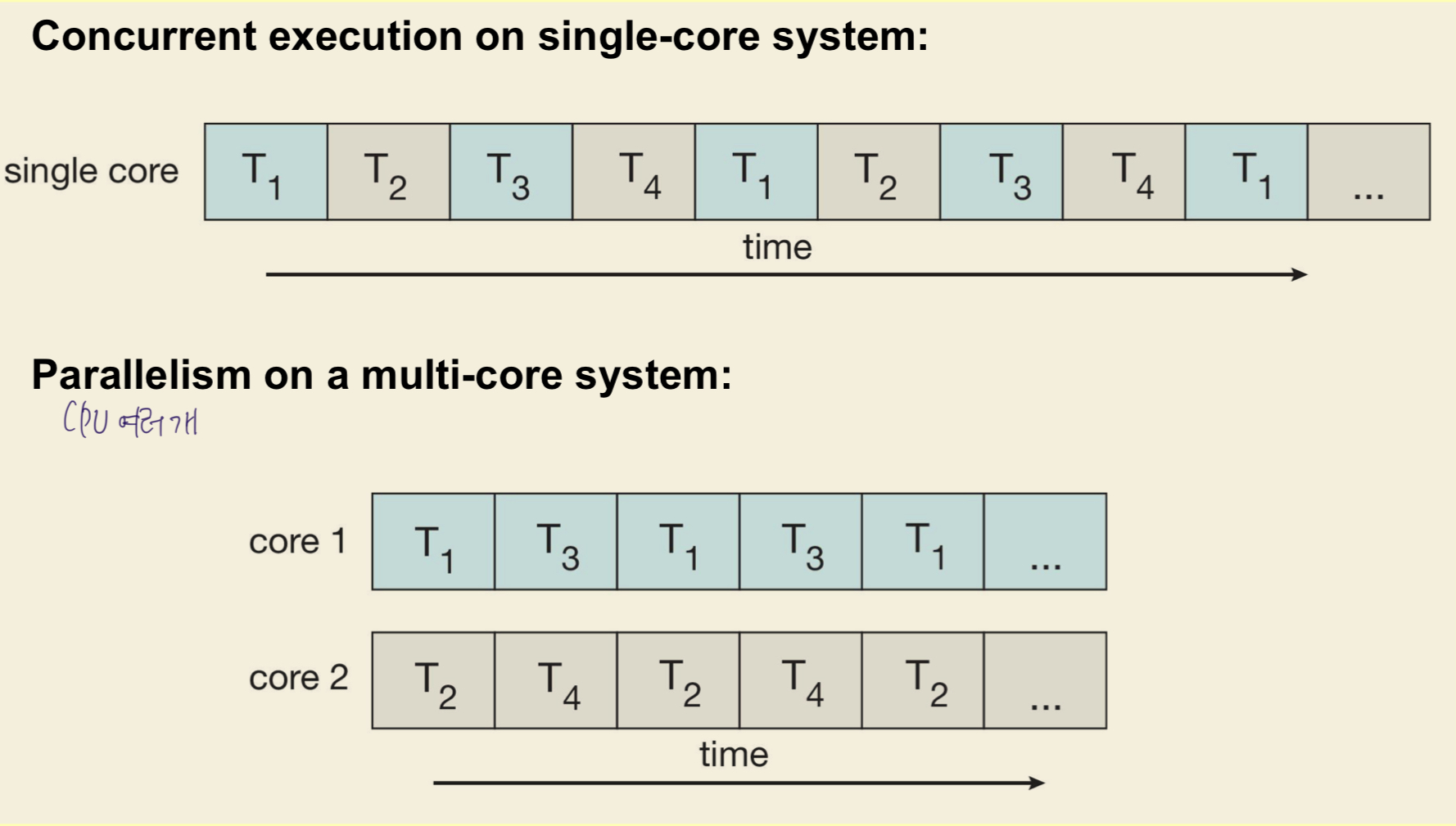 병렬성(parallelism): 시스템이 하나 이상의 작업(task)를 동시에(simultaneously) 하는 것, 여러 코어에서 작업을 나눠서 수행