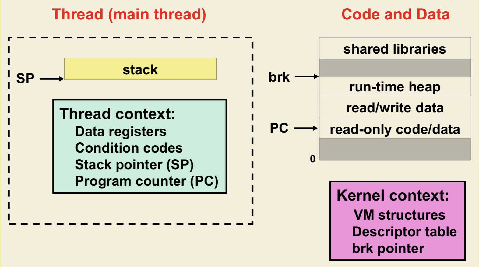 - (스레드) + (코드, 데이터, 커널 컨텍스트)로도 볼 수 있음