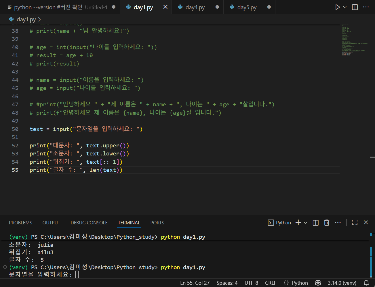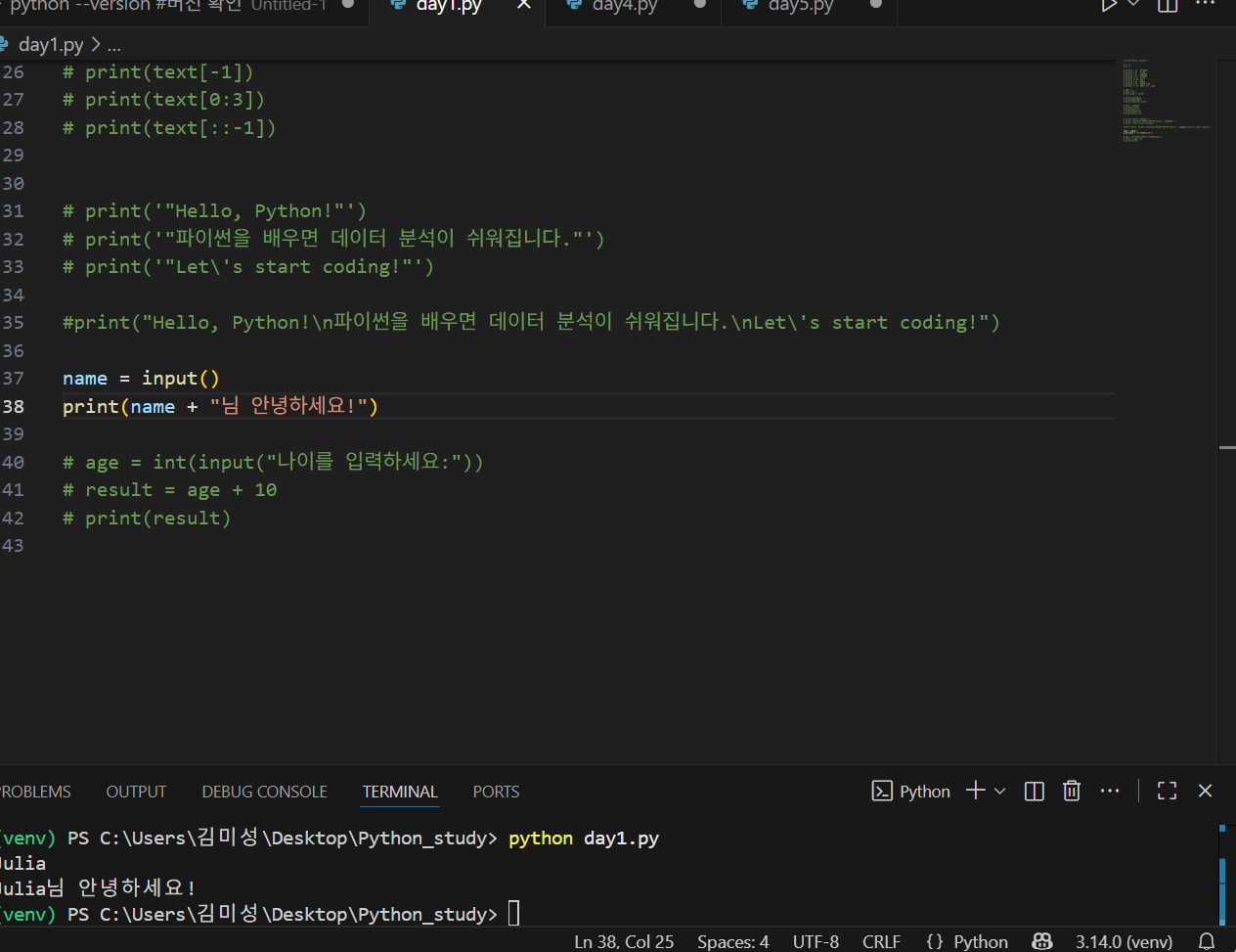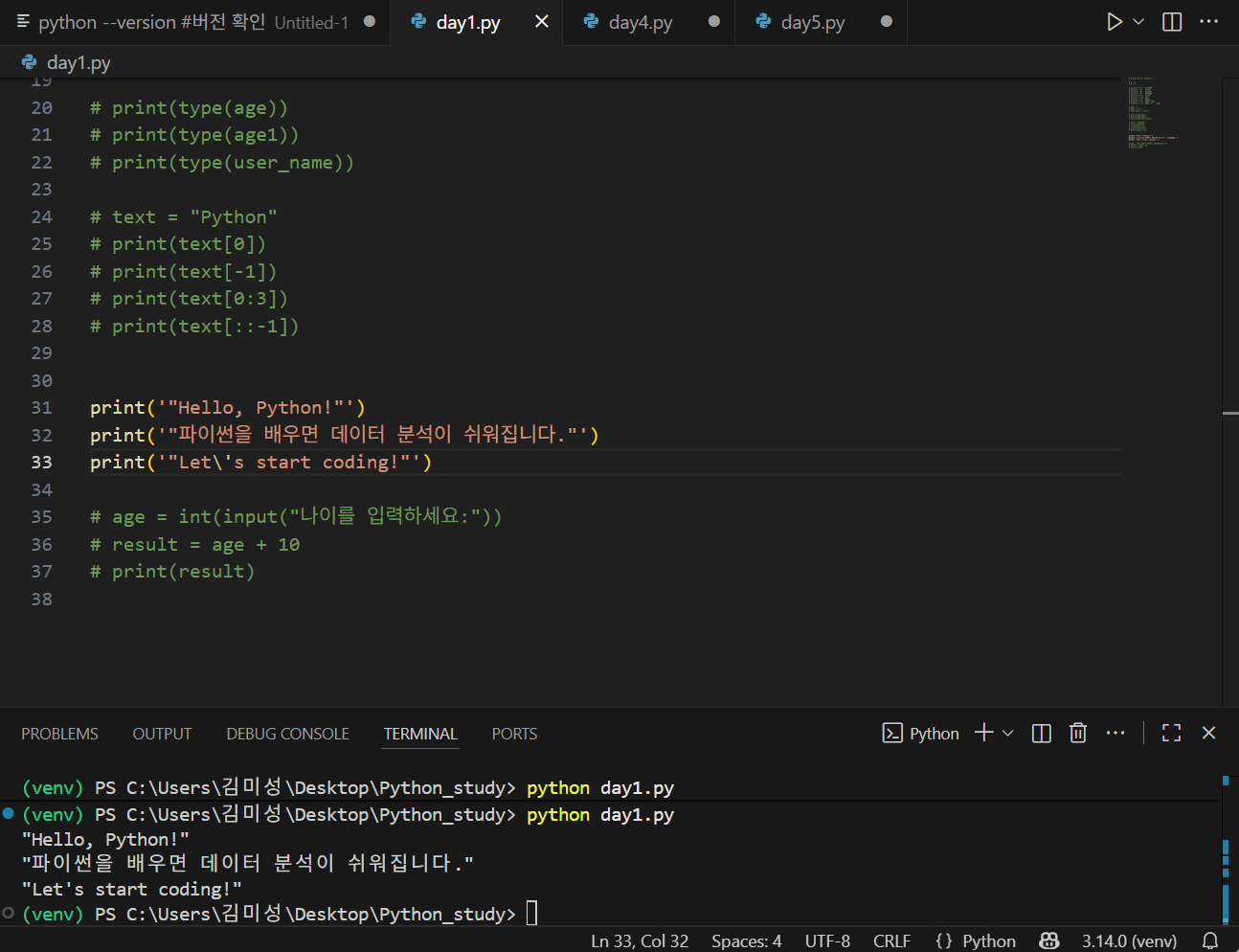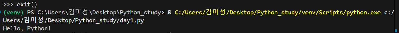 '(venv) PS C:\Users\김미성\Desktop\Python_study>'가 뜨면 터미널 세계인 것인데 파이썬 세계에서 터미널 세계로 이동하려면 터미널에 exit()를 입력해주면 된다.