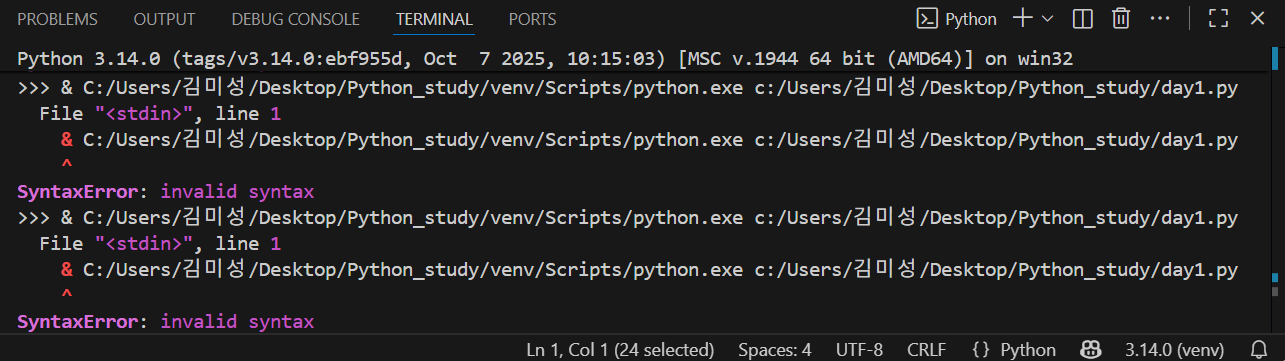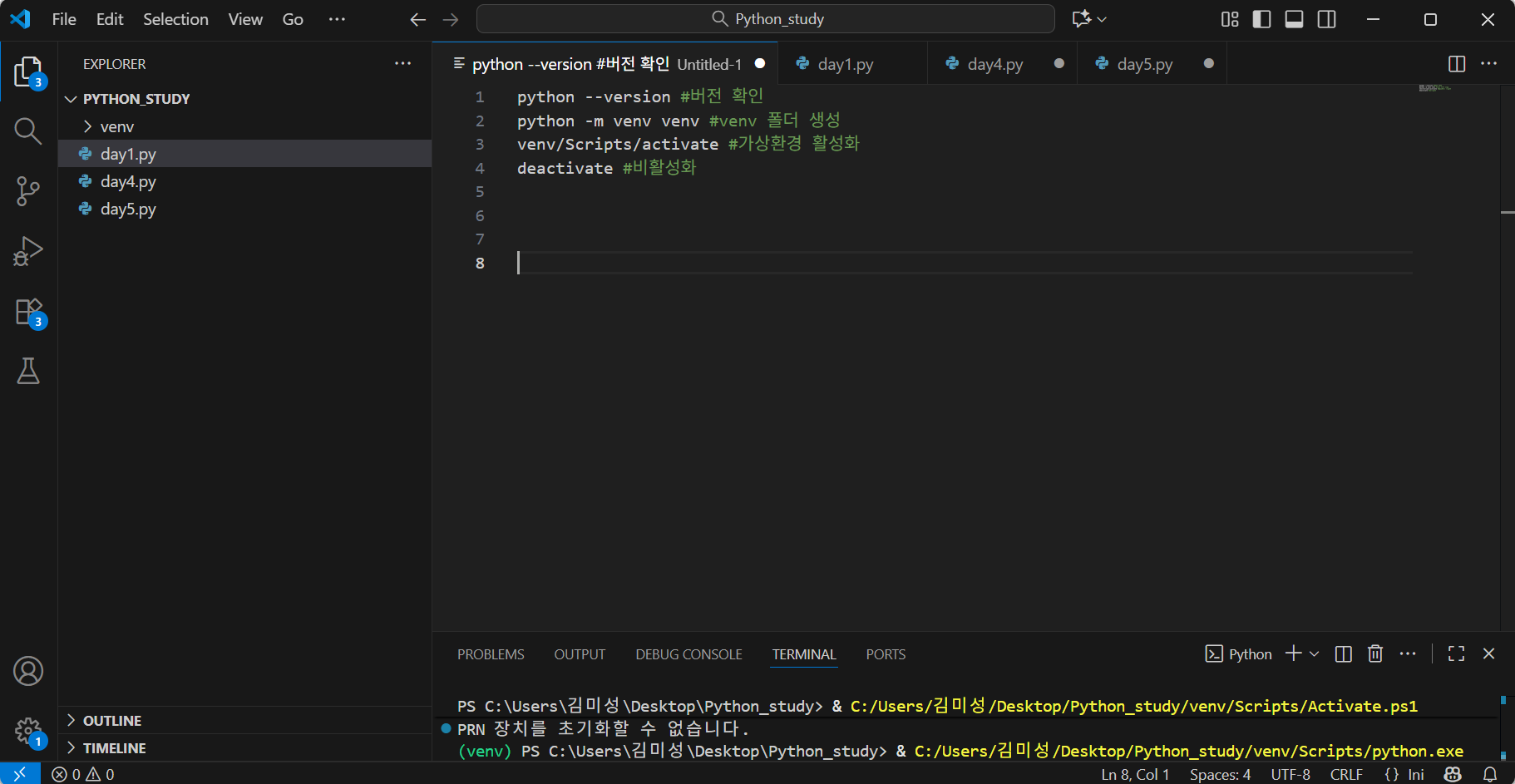 PS C:\Users\김미성\Desktop\Python_study> & C:/Users/김미성/Desktop/Python_study/venv/Scripts/Activate.ps1
