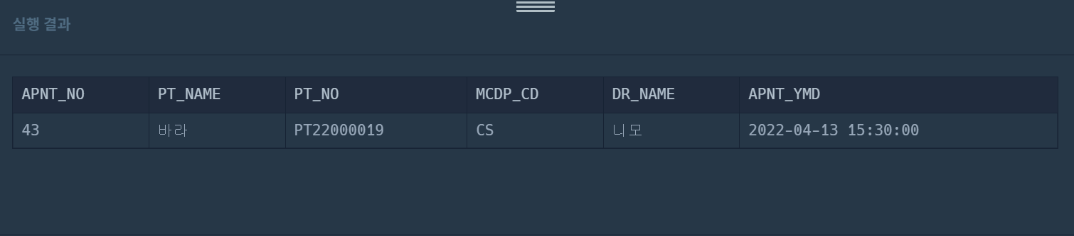 WHERE a.APNT_YMD LIKE '2022-04-13%'