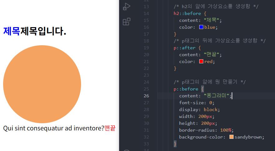 html문서내에는 보이지 않지만 미리 정의한 위치에 가상의 요소를 넣어 표현할 수 있다.