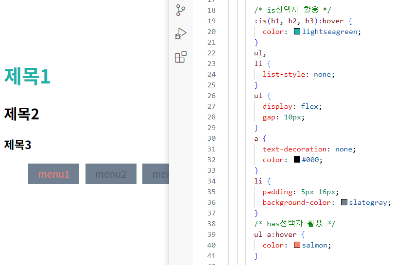 :is(선택자1, 선택자2, 선택자3...){ }