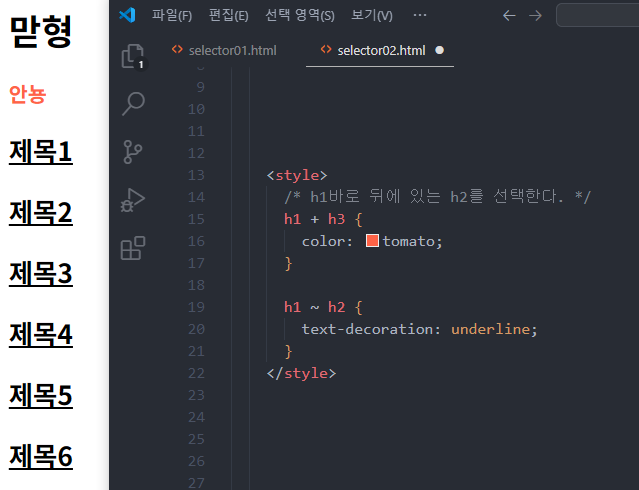 동위 선택자(형제 선택자)는 형제관계에서 뒤에 위치한 동생태그들을