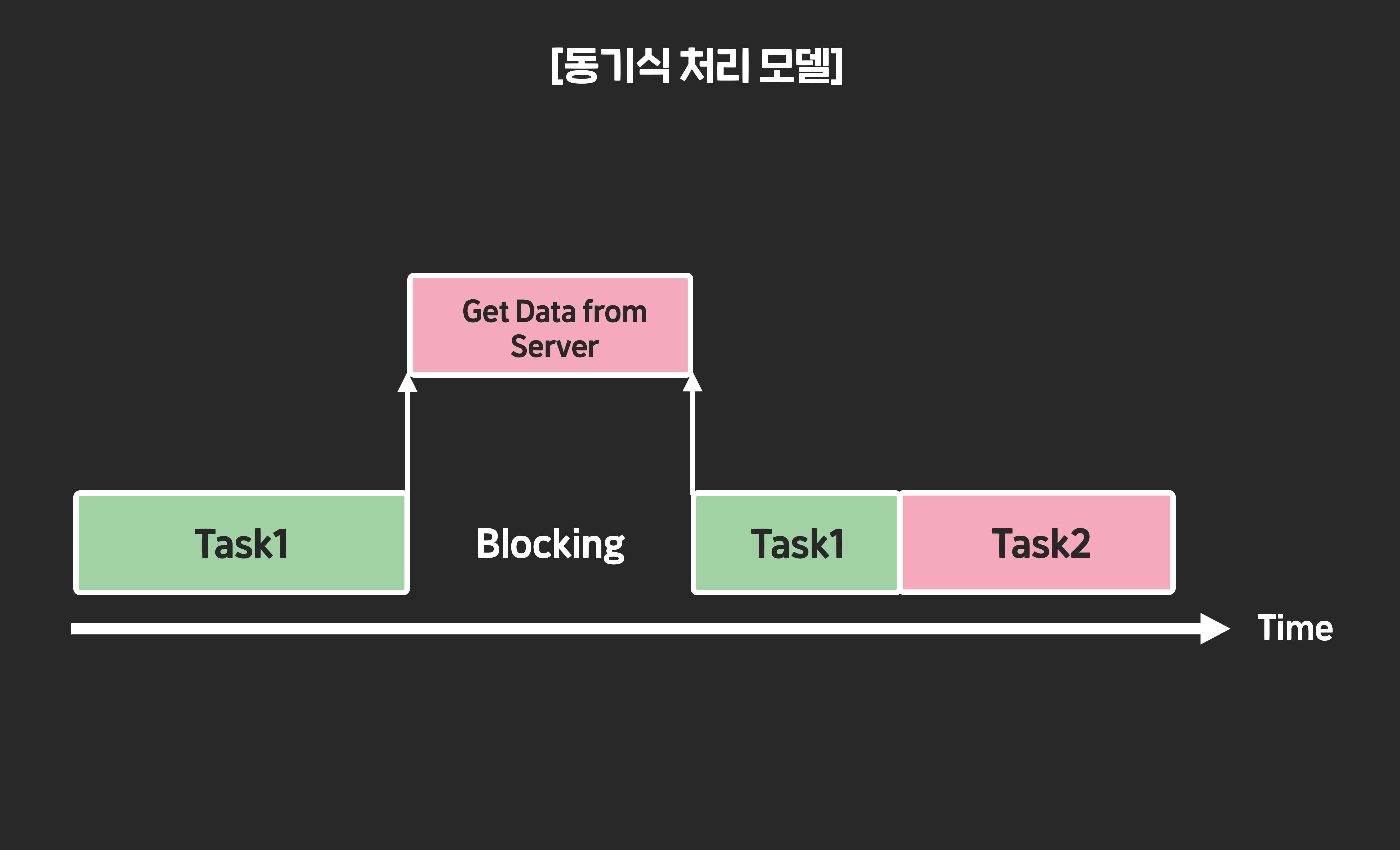 만약 서버에서 데이터를 가져와서 화면에 표시하는 작업을 수행할 때, 서버에 데이터를 요청하고 데이터가 응답될 때까지 이후 태스크들은