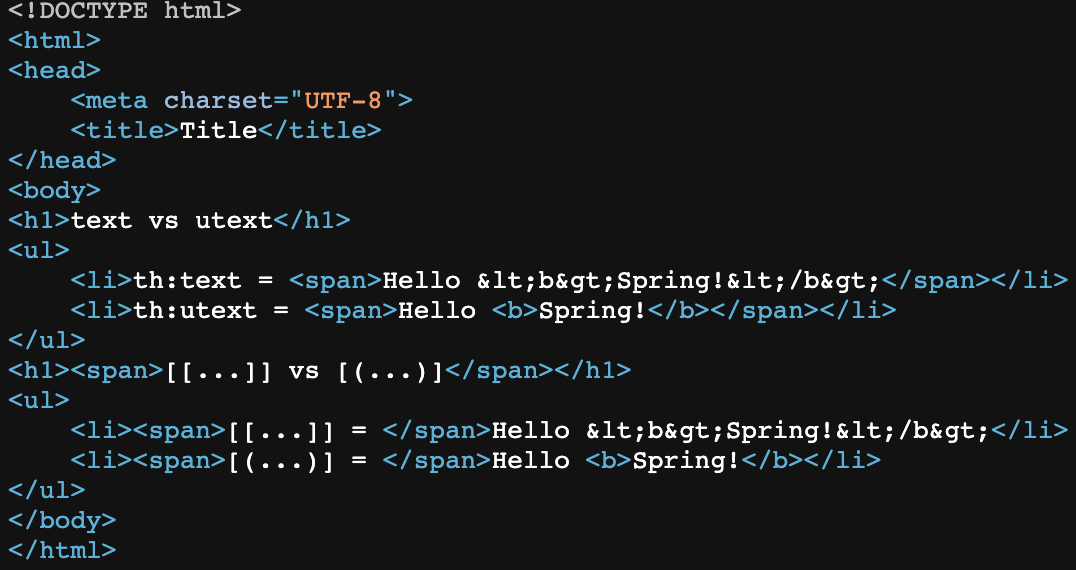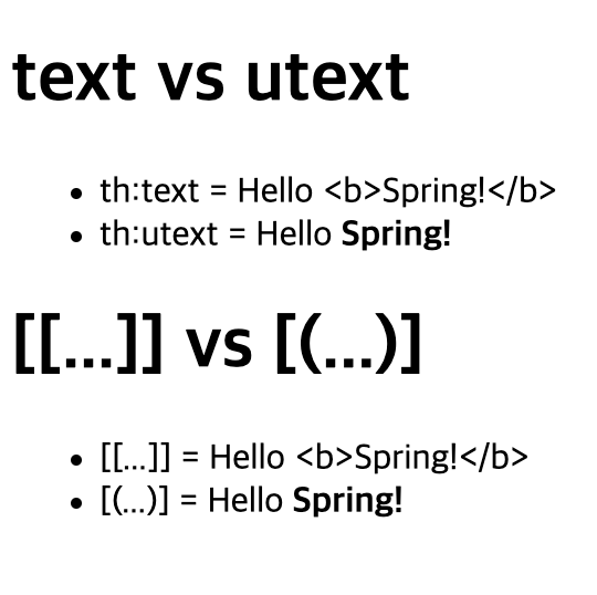 HTML에서 사용하는 특수 문자를 HTML 엔티티로 변경하는 것을 이스케이프(escape)라 한다. 그리고 타임리프가 제공하는 th:text , [[...]] 는 기본적으로 이스케이스(escape)를 제공한다.