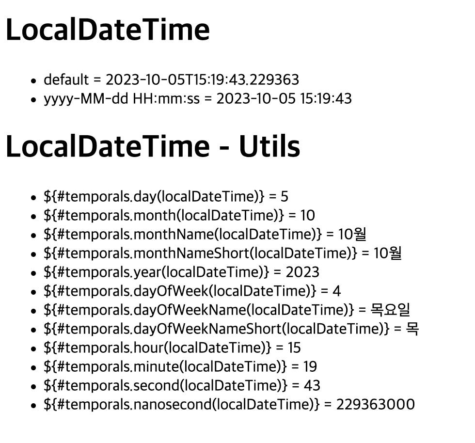 <li>${#temporals.day(localDateTime)} = <span th:text="${#temporals.day(localDateTime)}"></span></li>