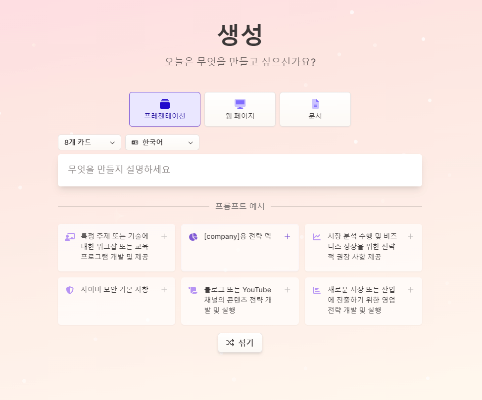 하지만 감마닷 AI는 다양한 템플릿과 디자인 옵션을 제공하므로, 사용자가 원하는 스타일을 어느 정도 반영할 수 있습니다.