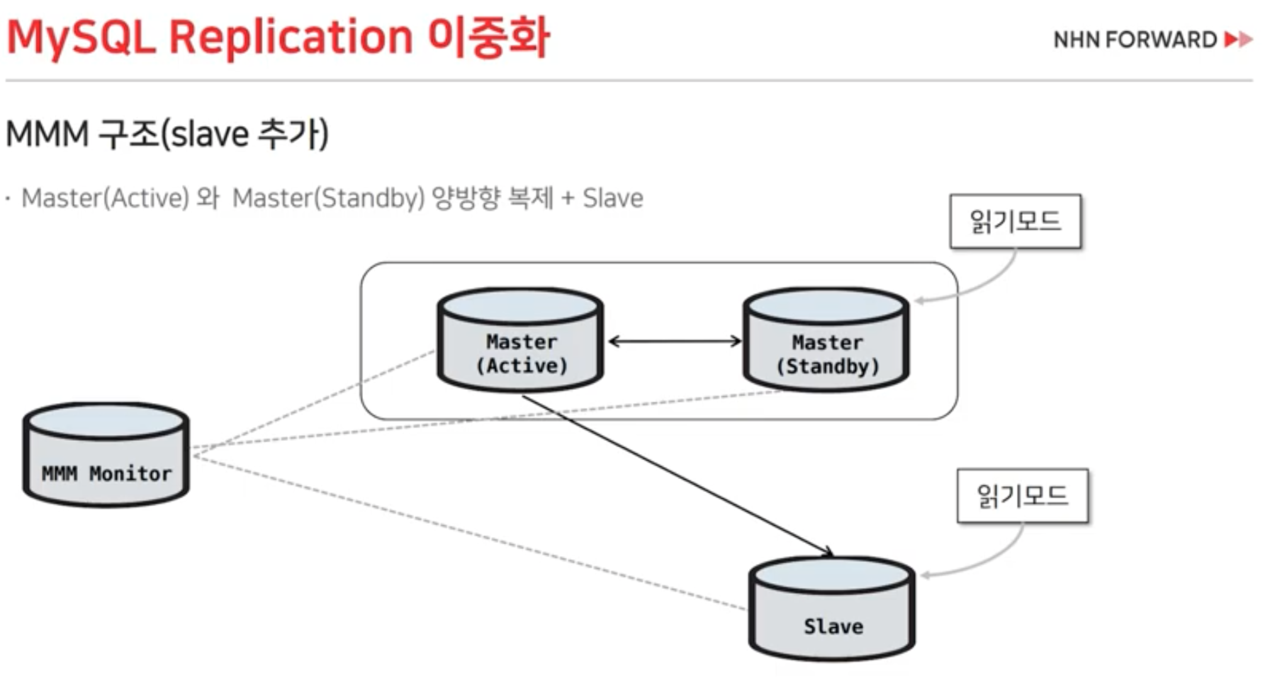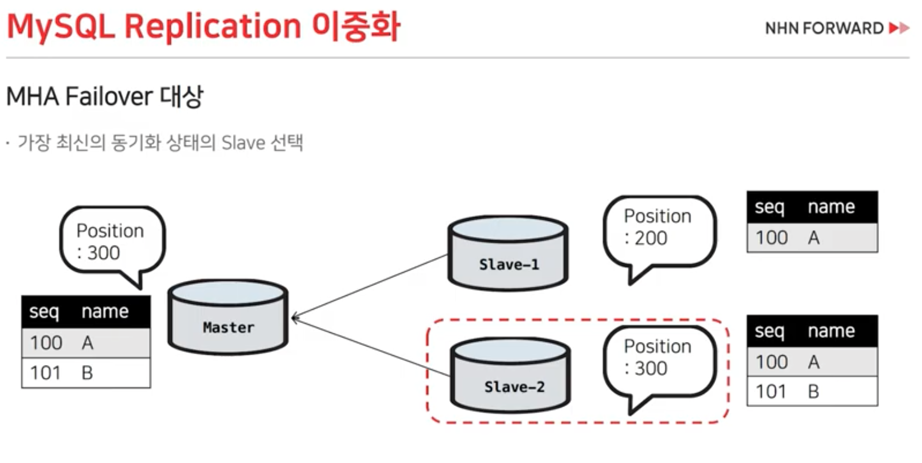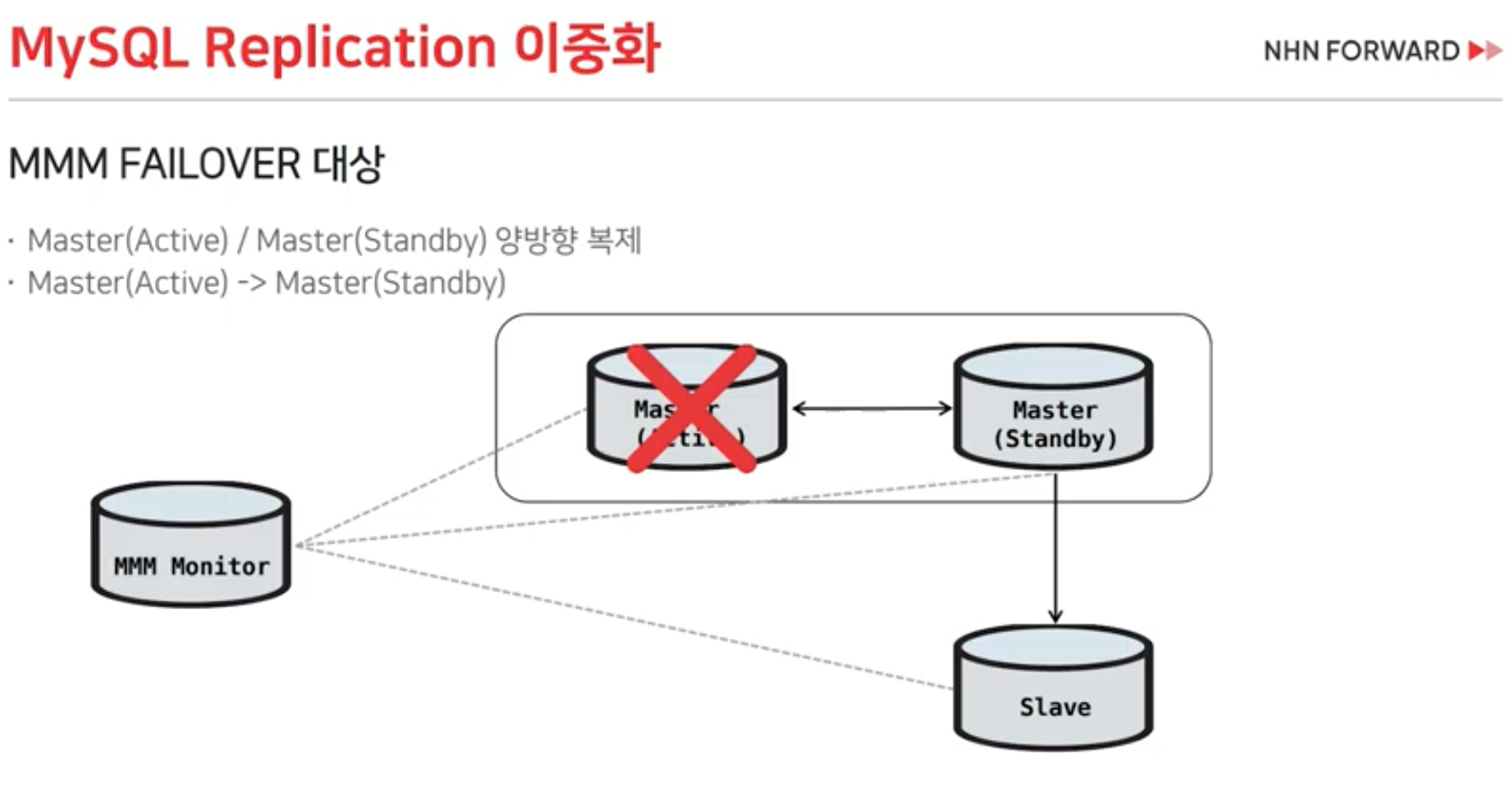 - MMM과 달리, 가장 최신 동기화 상태의 Slave를 선택하여 신규 Master로 승격시킵니다.