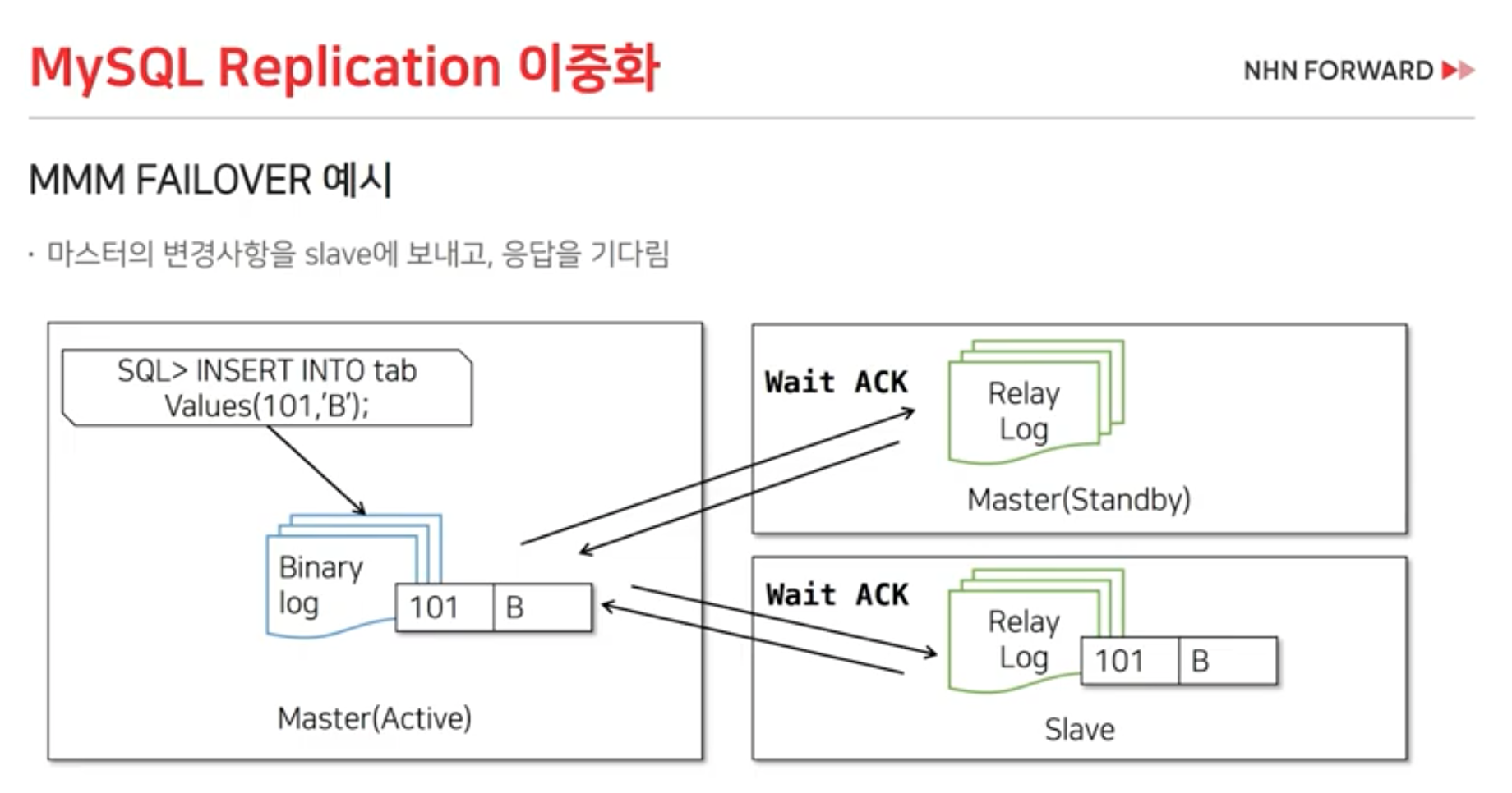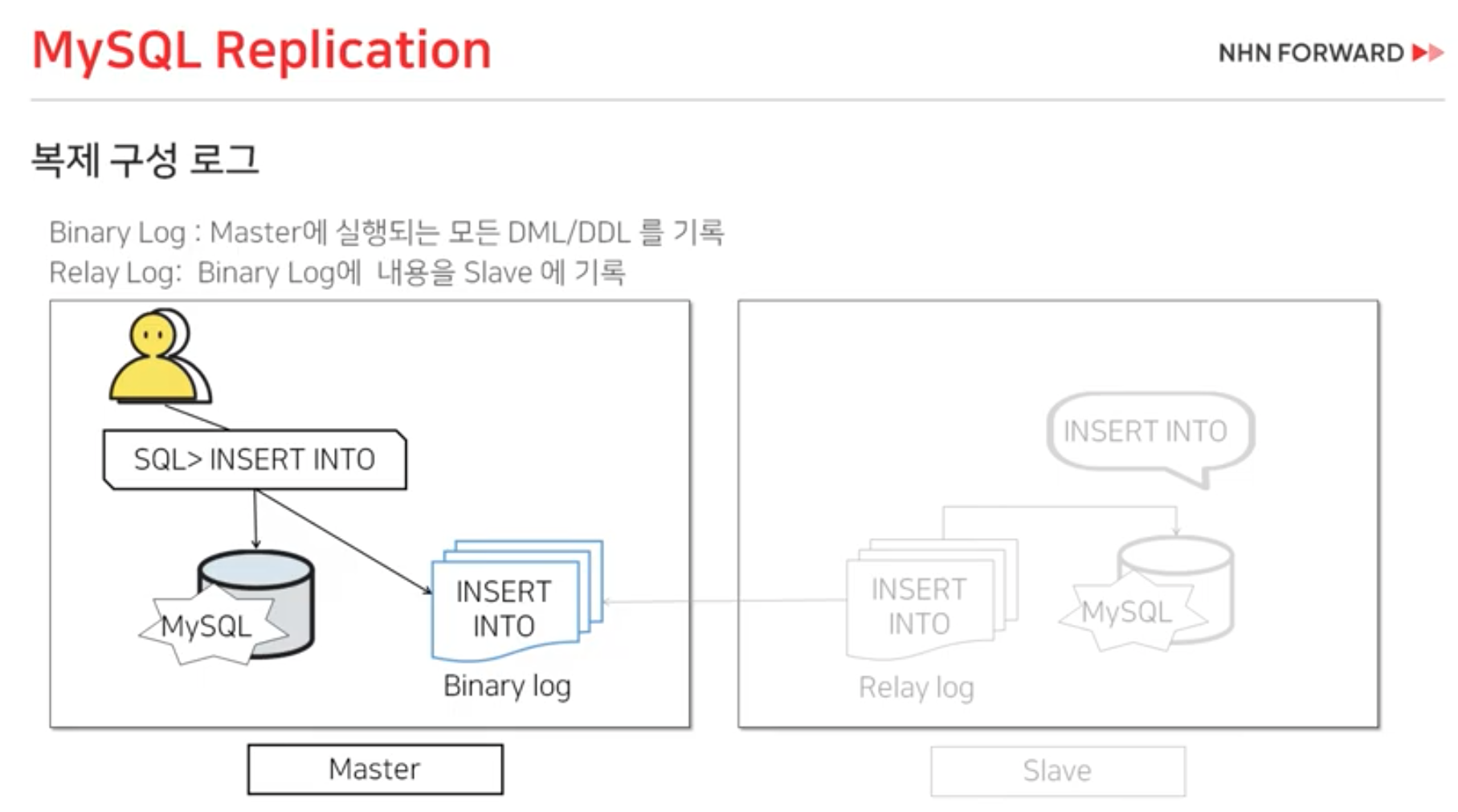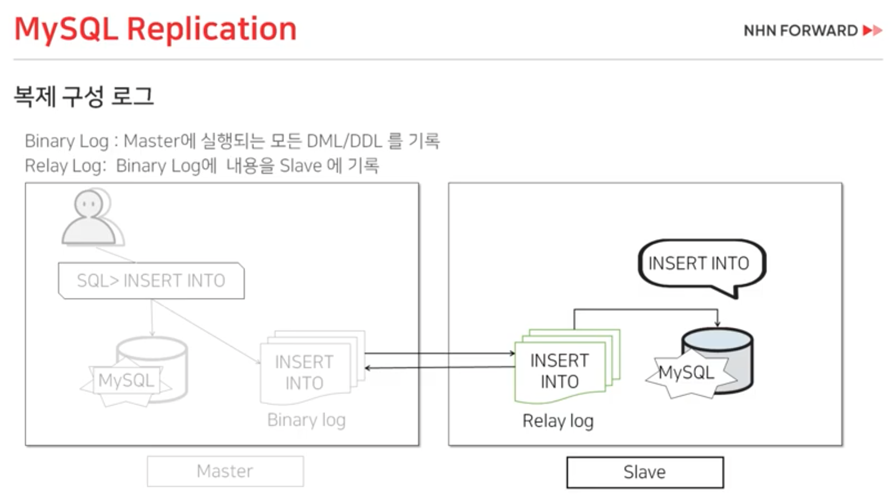 binary log라는 파일 로그에 기록되고 Master DB에서 실행이 됩니다.- Slave DB에서 binary log를 감시하다가 새로운 명령어가 생기면 relay log로 가져옵니다.