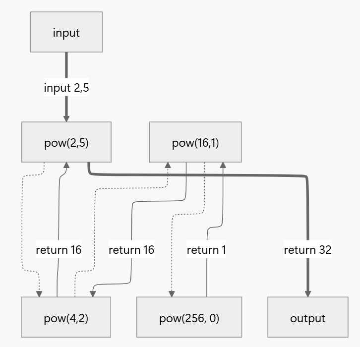 pow(2,5)에서 5 == 0이 false이고 5가 홀수이므로2 * pow(2 * 2, (5 -1)/2) 연산 과정에서 pow(4,2)를 호출pow(4,2)에서 2 == 0이 false이고 4가 짝수이므로pow(4 * 4, 2 / 2) 연산 과정에서 pow(16,1)을 호출pow(16,1)에서 1 == 0이 false이고 1이 홀수이므로16 * pow(16 * 16, (1 - 1) / 2 ) 연산 과정에서 pow(256, 0)을 호출pow(256,0)은 종료 조건을 만족하므로 1을 반환pow(16,1)은 16 * pow(256, 0)의 결과로 16을 반환 pow(4,2)는 pow(16,1)의 결과로 16을 반환pow(2,5)는 2 * pow(4,2)의 결과인 32로 최종값을 도출x^n연산에서 재귀 방식은 O(log₂ n)의 복잡도를 가짐(n == 0) return 0(n == 1) return 1재귀 호출: