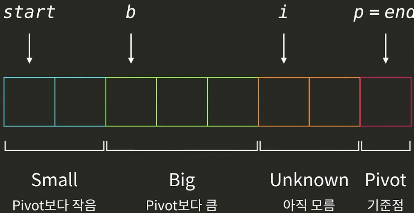 # i 인덱스의 값이 기준점보다 작으면 i와 b 인덱스에 있는 값들을 교환하고 b를 1 증가 시킨다