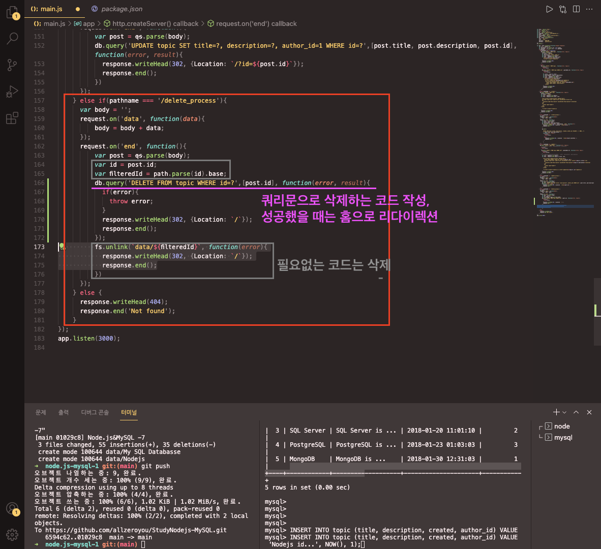- 쿼리문으로 글을 삭제하는 코드를 작성하자. 성공했을 때는 홈으로 리다이렉션되게끔 변수명을