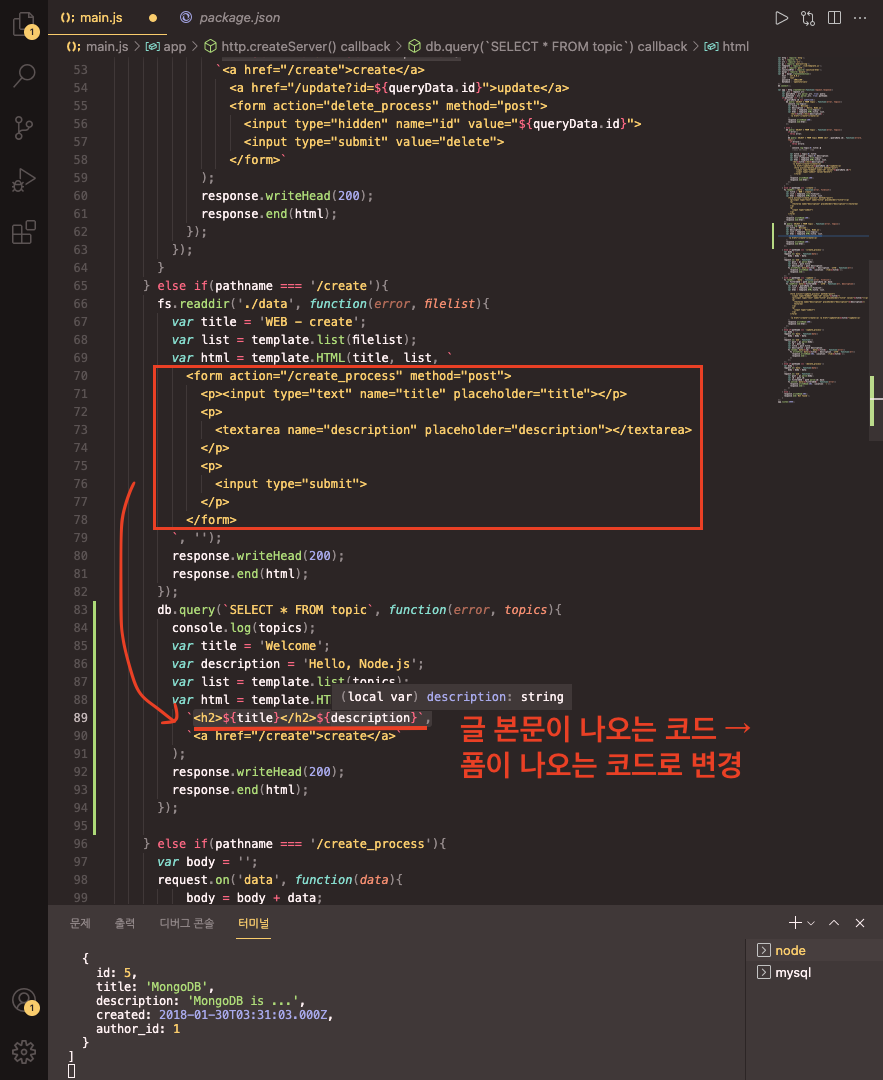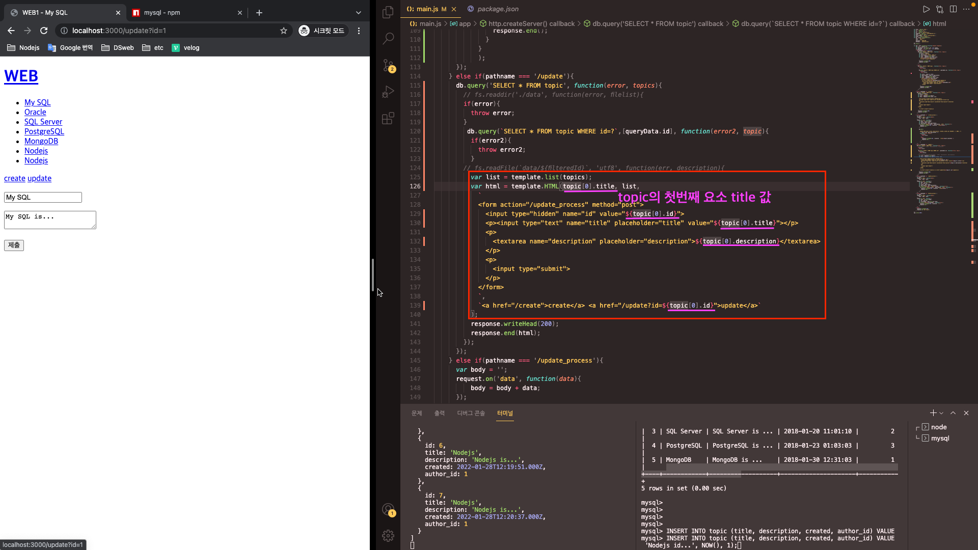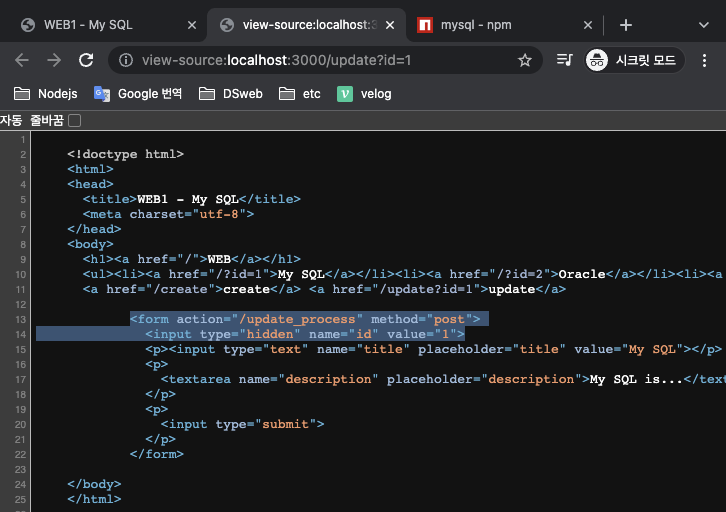 - html 변수 부분의 변수값을 topic의 첫번째 요소 title 값으로 변경한다. 또한 form 코드 부분에서 변수값을