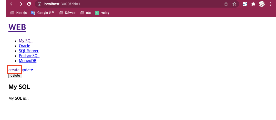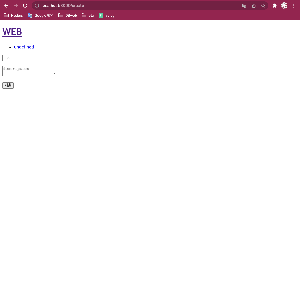 - create를 눌렀을때 글목록이 잘 보이도록 구현한 모습이다. 이제 사용자가 글을 작성한 후 submit 했을때 처리되는 코드는