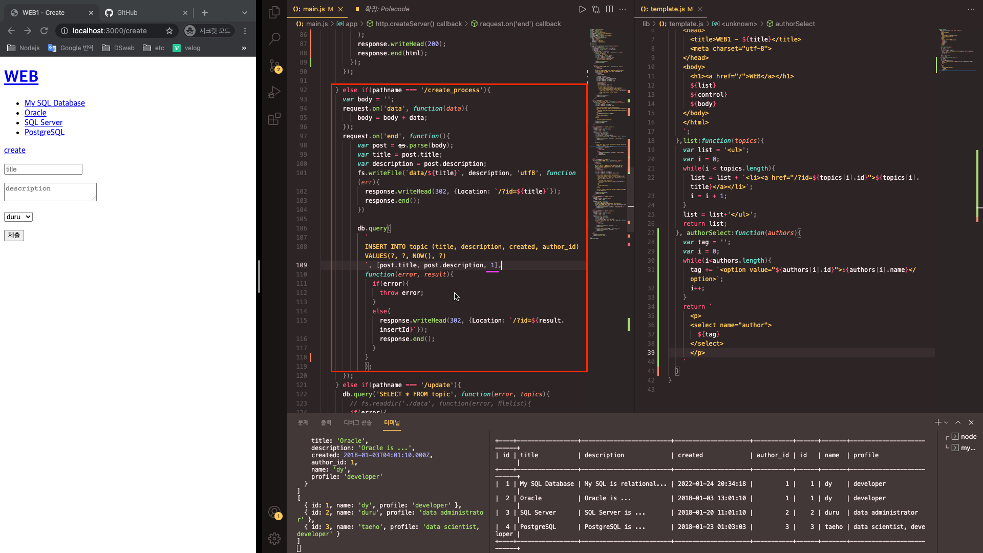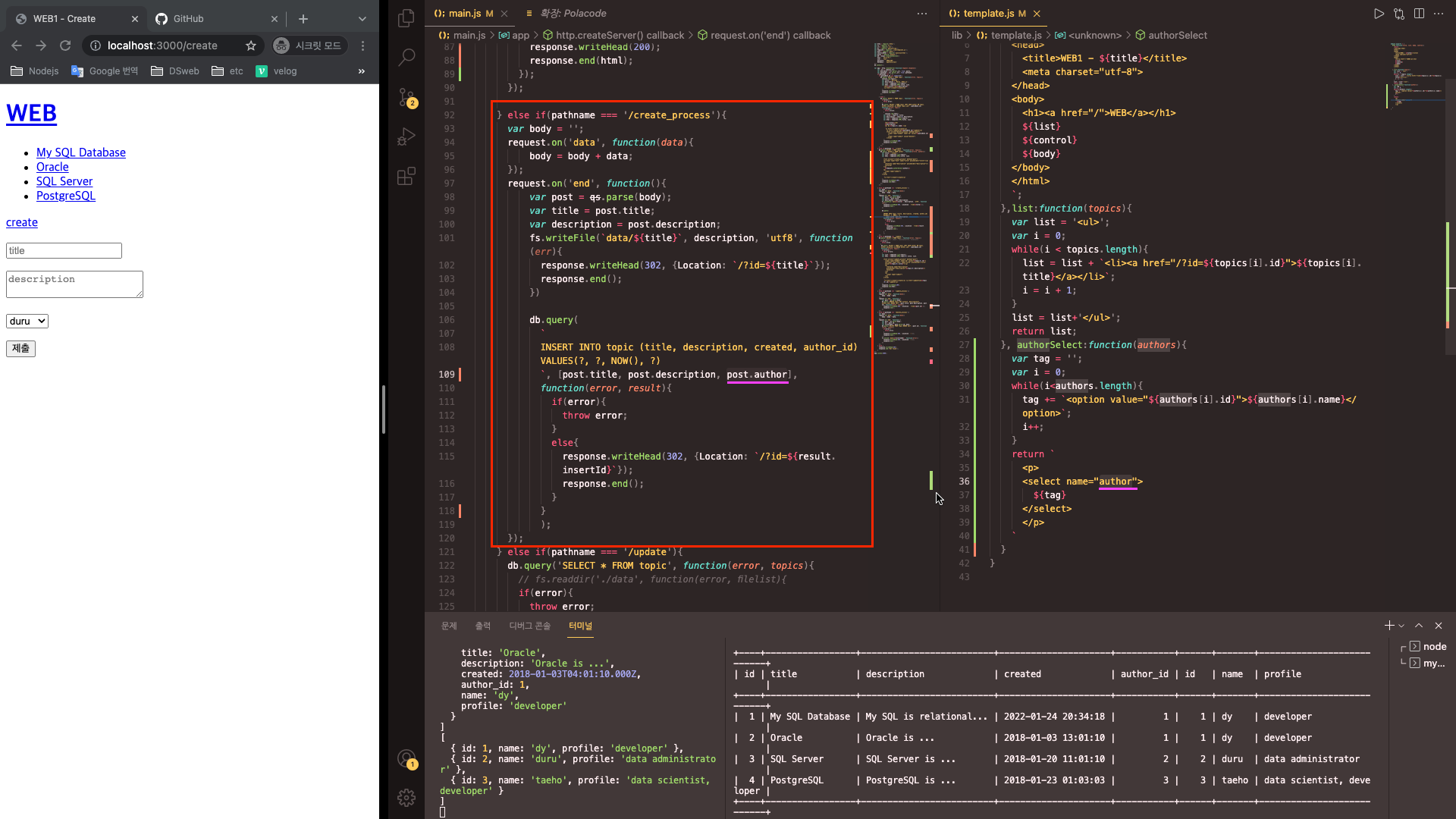 - template.js 문서로 콤보박스 코드를 뺄까 한다. template.js의 함수 authorSelect를 만들어 파라미터로 authors를 준다. 작성한 코드를 복붙한 다음, return 값에는 출력할 콤보박스 안 정보를 담는데, 백틱기호를 꼭 빼먹지 말고 쓰자. main.js에는 복붙한 코드는 지운 다음, p태그 안 ${template.authorSelect(authors)}로 작성하자. 그럼 이제 사용자가 submit을 하면 그 정보를 받아와야 한다. 이때 create_process를 봐보자.