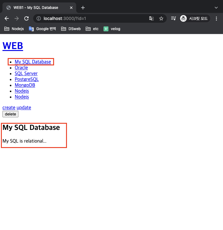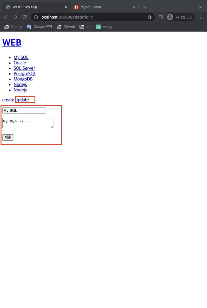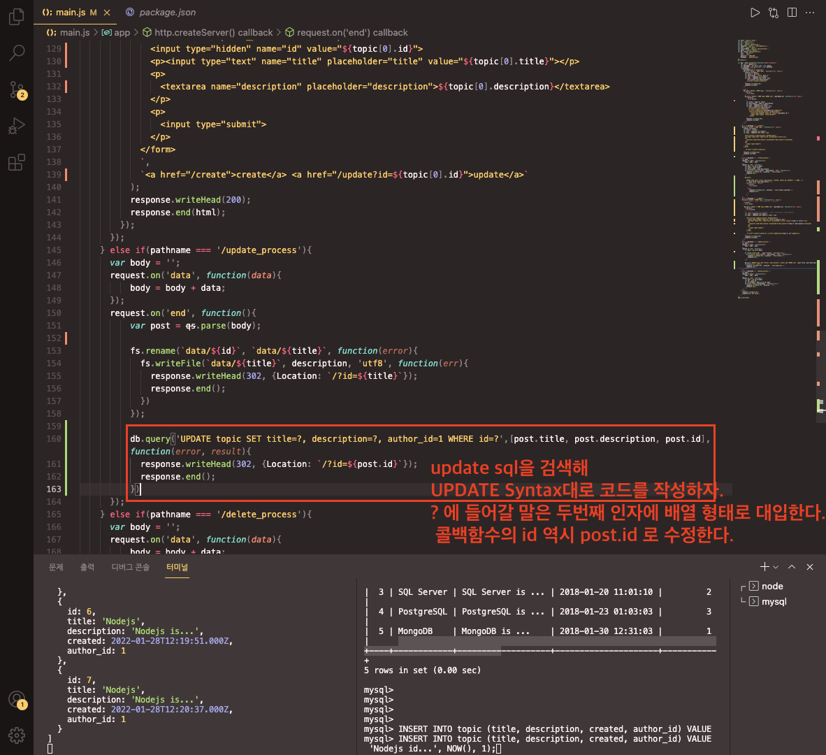 - update sql을 검색해 syntax대로 코드를 작성하자 ?에 들어갈 말은 함수의 두번째 인자에 파라미터 변수를 추가한다. 그러면 자동으로 sql의 ' ? ' 에 매핑되어 sql이 실행된다. (단, 물음표 순서는 array 순서대로 해야한다. 그 다음 콜백함수의 id 역시 post.id로 수정하자.