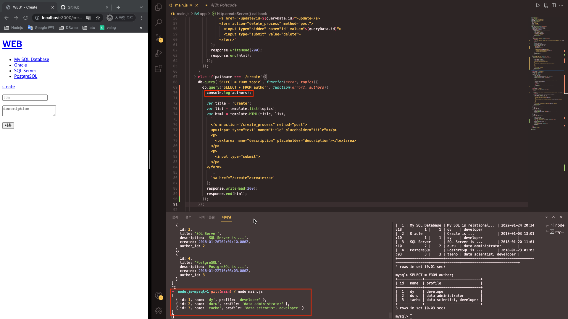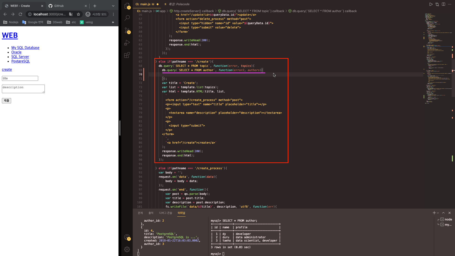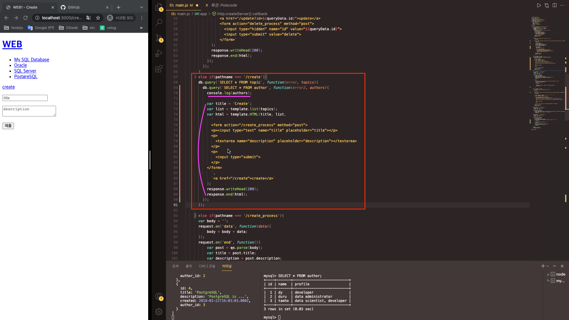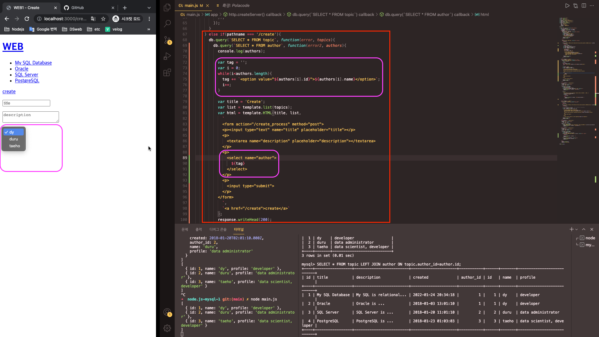 - 글 작성 시 작성자를 선택하기 위해서는, 작성자목록을 데이터베이스에서 가져와야 한다. 따라서 db.query를 이용해 작성자목록을 가져오는 sql문을 작성한 다음 두번째 인자로 그 결과를 받는 콜백함수를 작성한다.