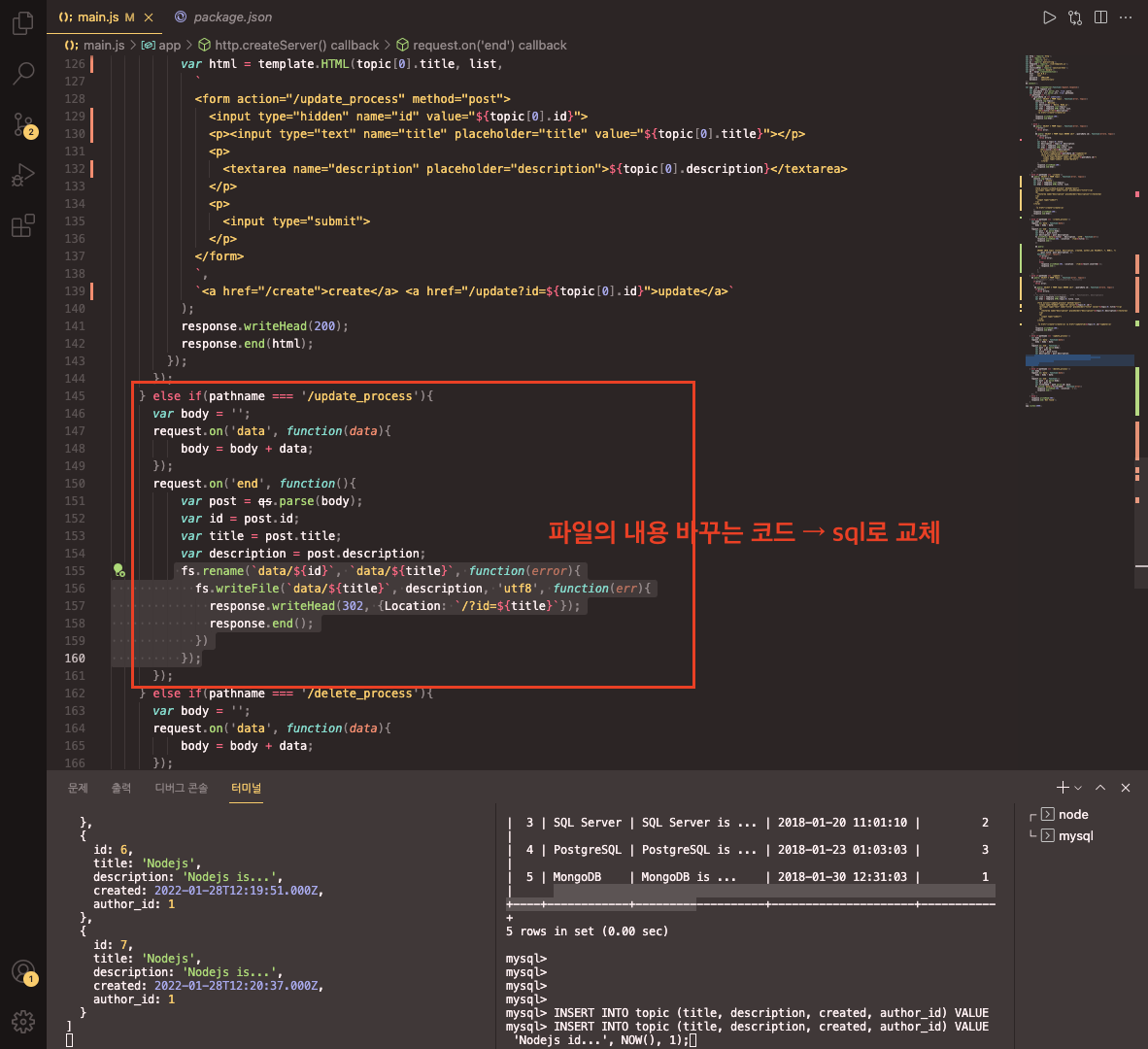 - update_process 코드에서 파일의 내용을 바꾸는 코드를 sql 으로 교체하자.