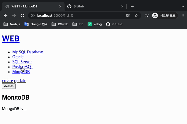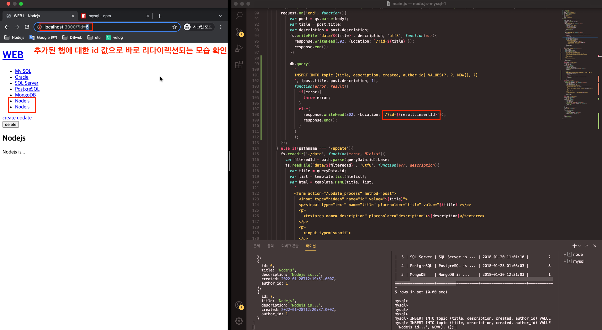- 노드를 reload 하였을때 추가된 행에 대한 id 값으로 바로 리다이렉션 되는 모습을 확인했다면 성공!