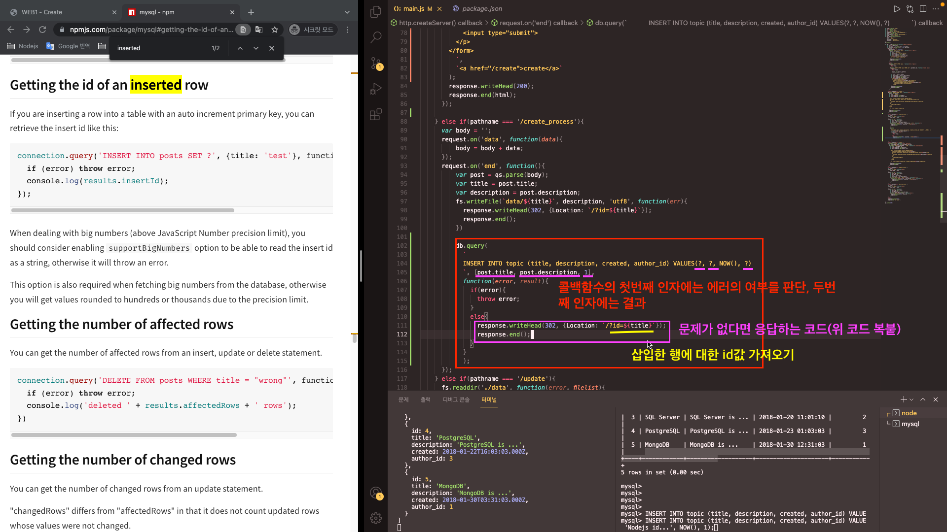 ?처리 한 후 뒤에 채울 데이터의 변수값을 넣자. 콜백함수의 첫번째 인자에는 에러의 여부를 판단하고 정상적으로 잘 되었을 때 응답하는 코드를 작성하자. 이때, id 값에 삽입한 행에 대한 id값을 가져와야 하는데, 새로 추가한 행에 대한 id값을 어떻게 가져올 수 있을까?