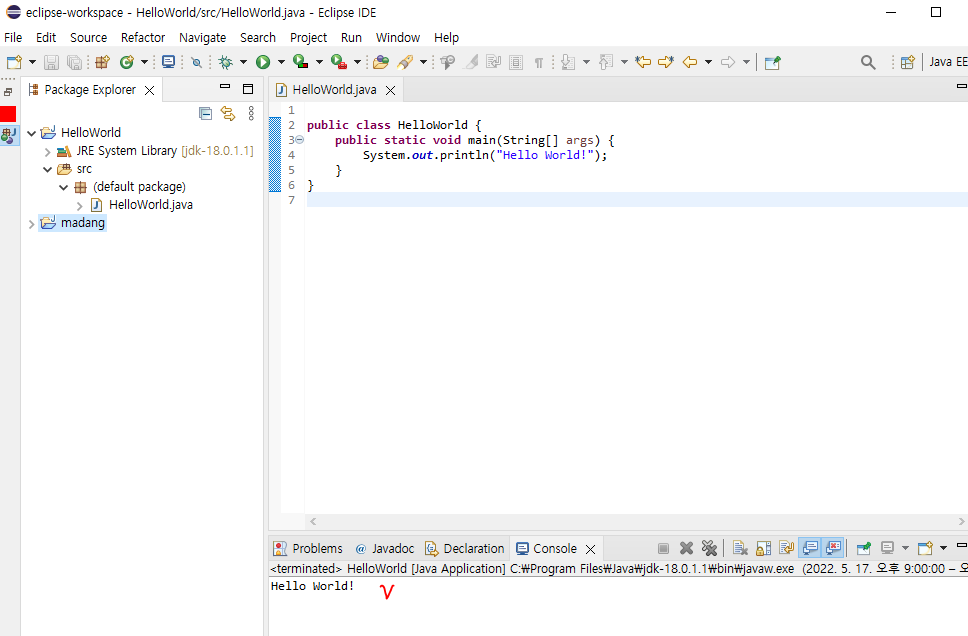 이클립스에 들어가서 HelloWorld 프로젝트의 console에 내용이 잘 보이면 ok