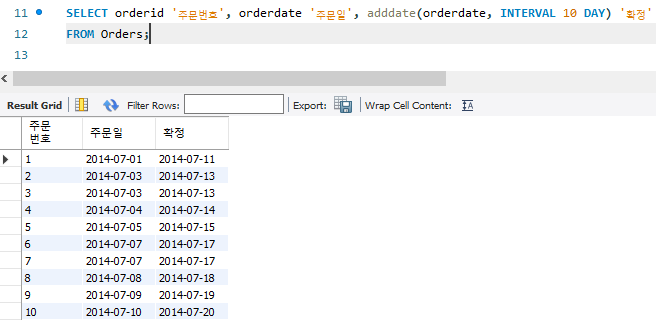 마당서점은 주문일로부터 10일 후 매출을 확정한다. 각 주문의 확정일자를 구하시오.