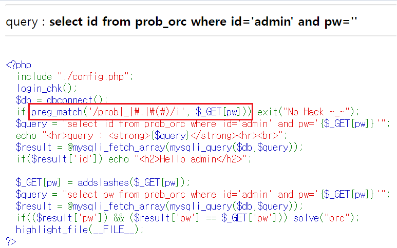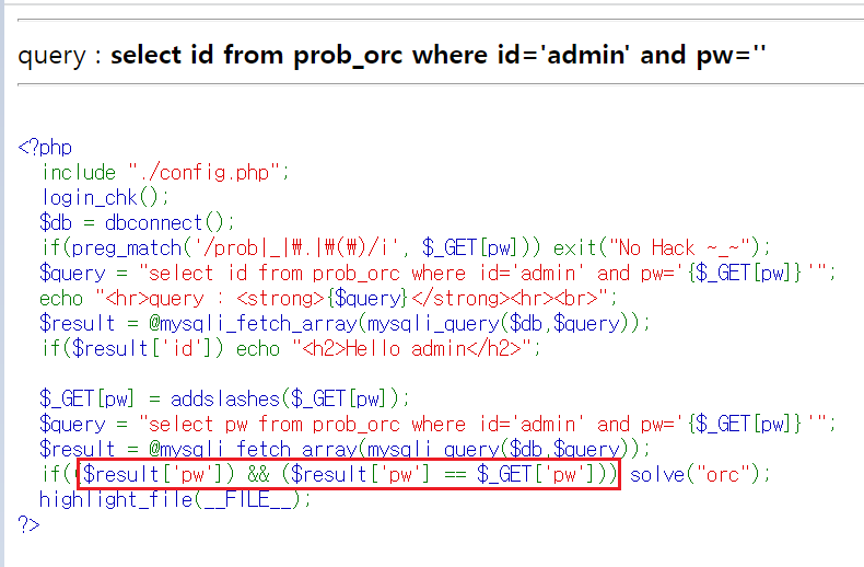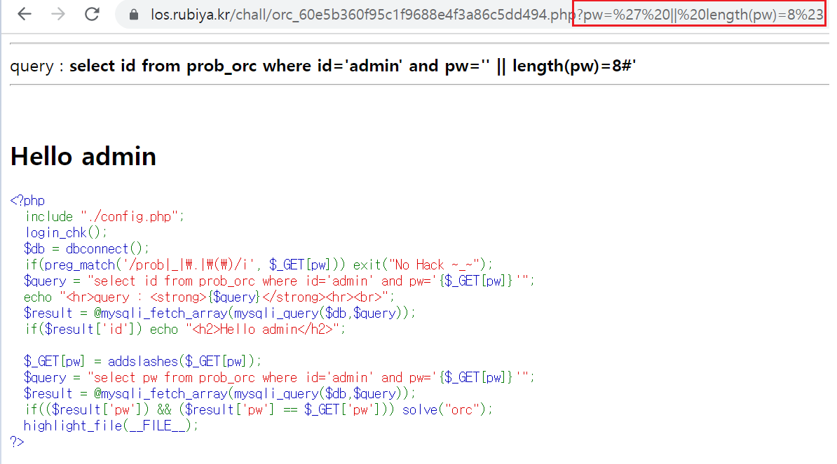 pw=' || length(pw)=8%23을 입력했을 때 'Hello admin'이 출력된 것을 보아 pw의 길이가 8이라는 것을 알 수 있다.