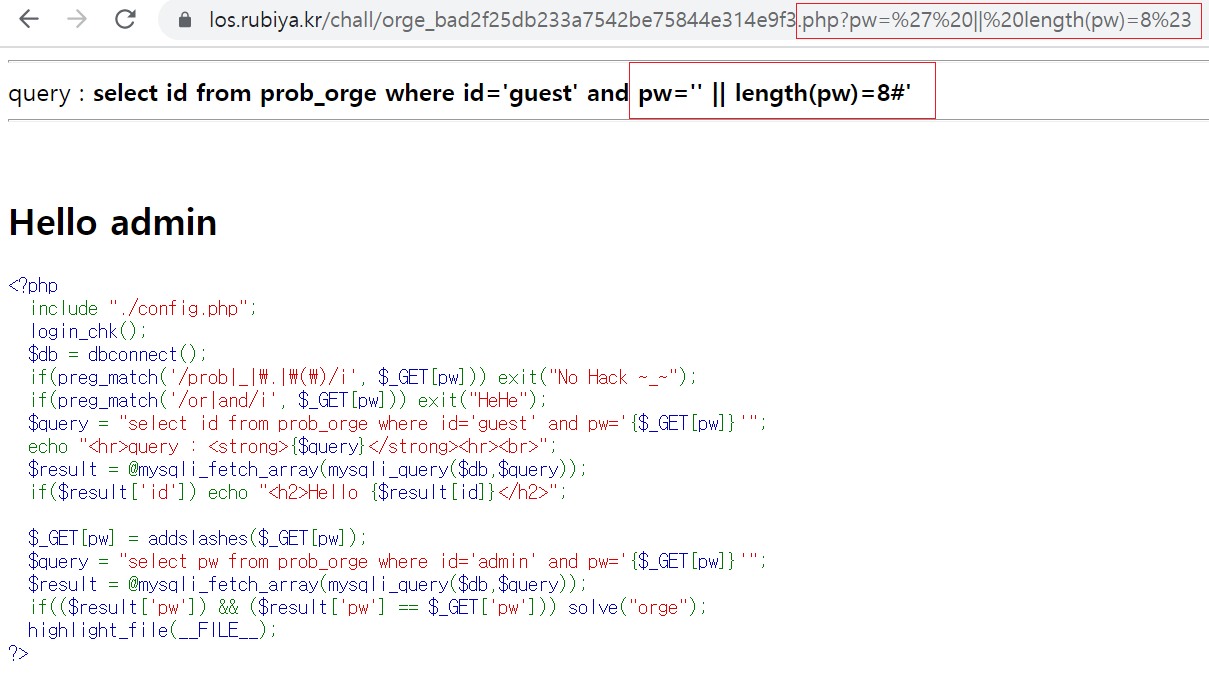 pw=' || length(pw)=8%23을 입력했을 때 'Hello admin'이 출력된 것을 보아 pw의 길이가 8이라는 것을 알 수 있다.
