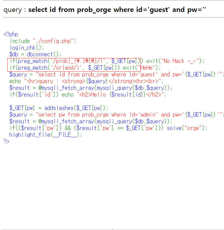해당 문제를 해결하기 위해서는 admin 계정의 정확한 PW를 입력해야만 한다. 4번의 orc 문제와 유사하나 or과 and 연산자를 필터링한다는 점이 다르다. or과 and는 각각 || 과 && 로 대체하여 사용하고자 한다.