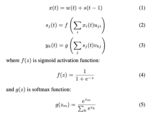 논문에서는 Elman 네트워크라는 단순한 형태의 RNN을 사용했습니다. 이 네트워크는 입력 층, 은닉 층(또는 컨텍스트 층), 출력 층으로 구성되며, 입력 벡터는 현재 단어와 이전 시간의 은닉 상태를 결합하여 형성됩니다. 은닉 층 상태와 출력은 각각 시그모이드 함수와 소프트맥스 함수를 사용하여 계산됩니다.
