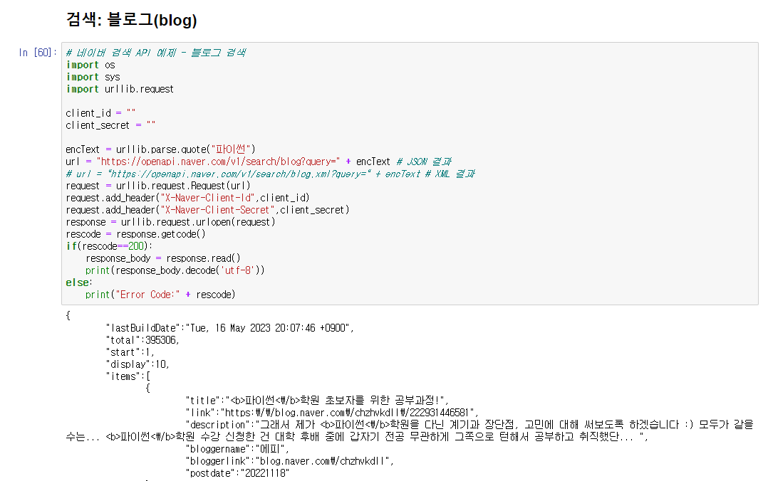 # url = "https://openapi.naver.com/v1/search/blog.xml?query=" + encText # XML 결과