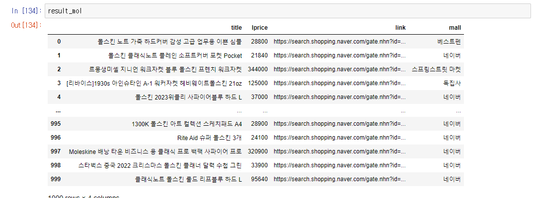 네이버 쇼핑에서 몰스킨을 검색하여 나온 결과를 정리하여 데이터프레임으로 정리해보자
