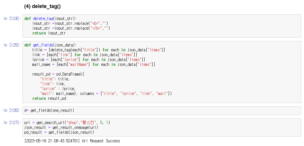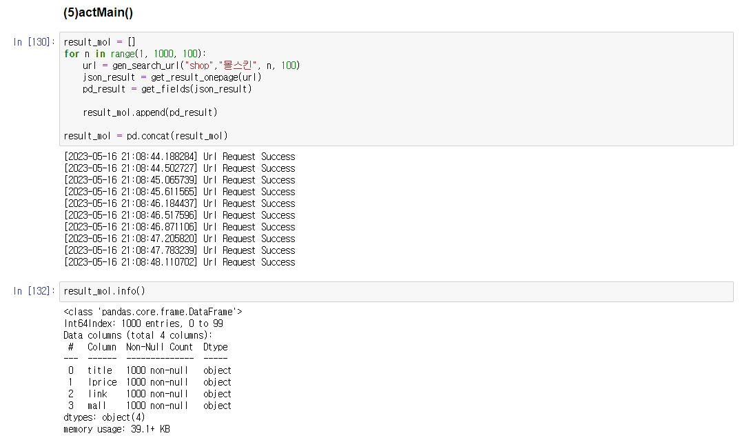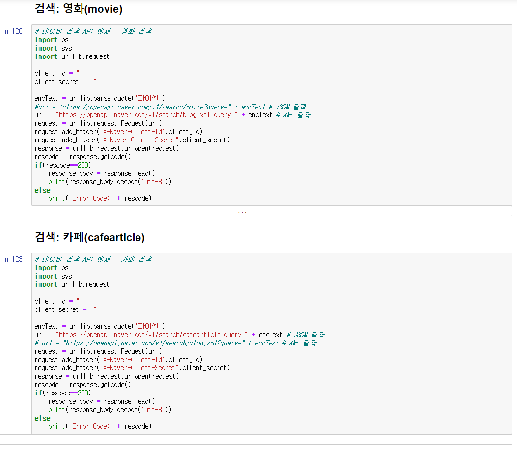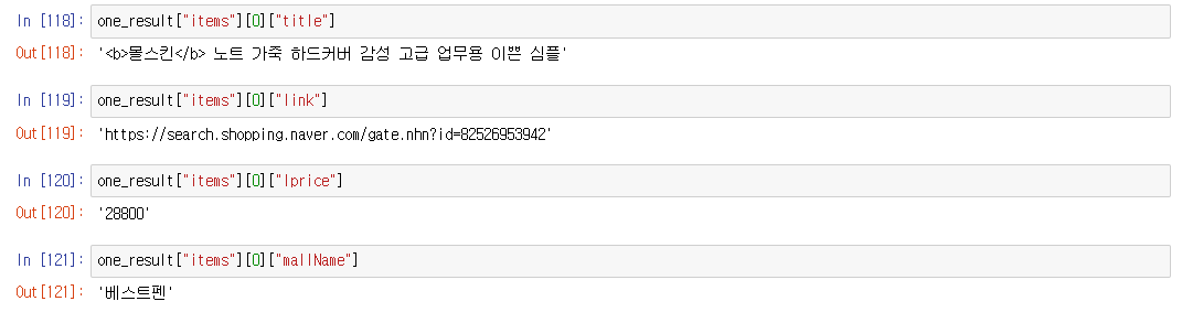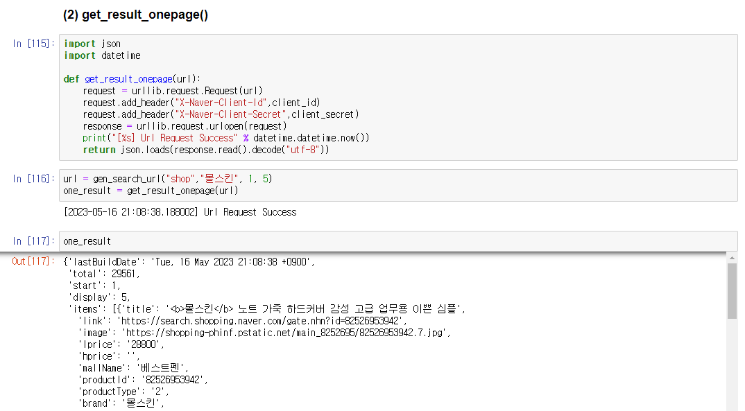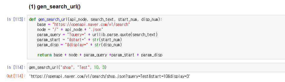 함수로 만든 URL을 이용하여 네이버 API로 사이트에서 검색하여 필요한 정보 추출