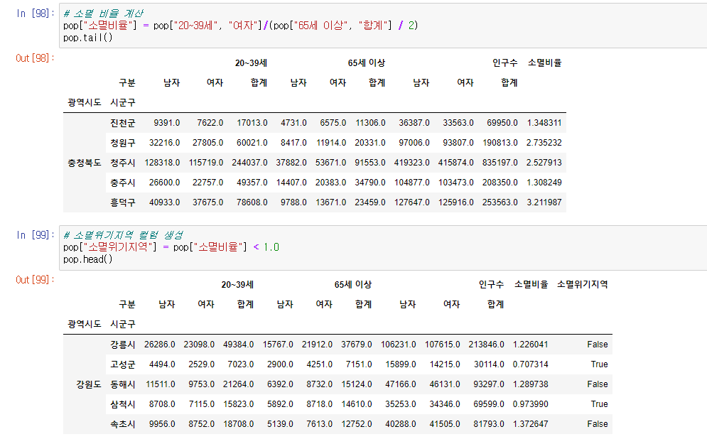pop["소멸비율"] = pop["20~39세", "여자"]/(pop["65세 이상", "합계"] / 2)