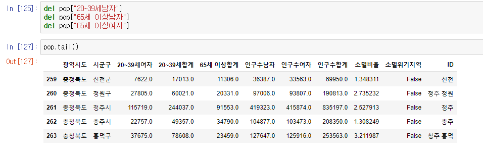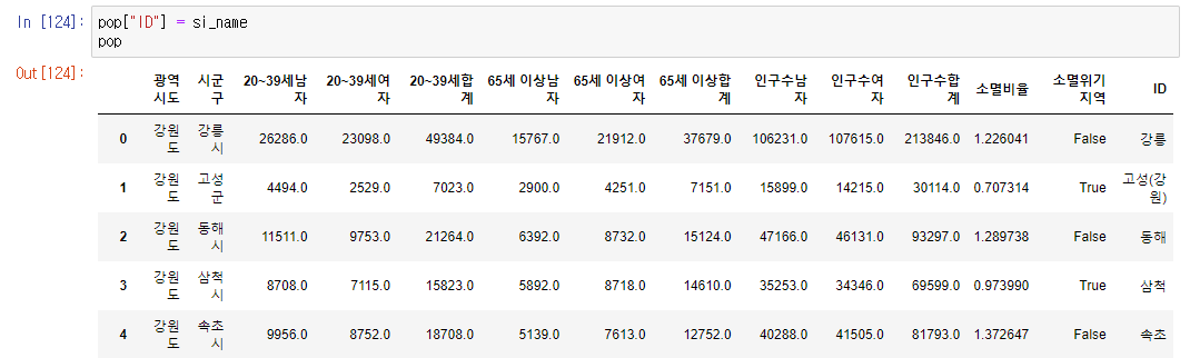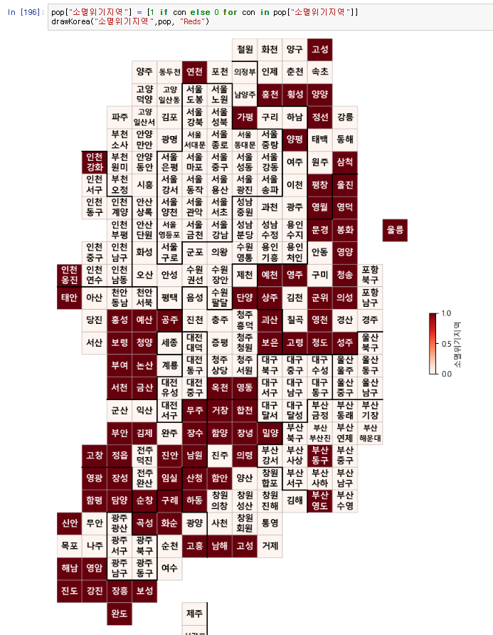 pop["소멸위기지역"] = [1 if con else 0 for con in pop["소멸위기지역"]]