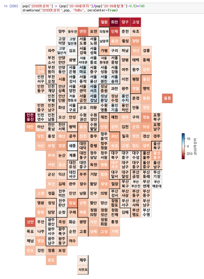 drawKorea("2030여성비",pop, "RdBu", zeroCenter=True)